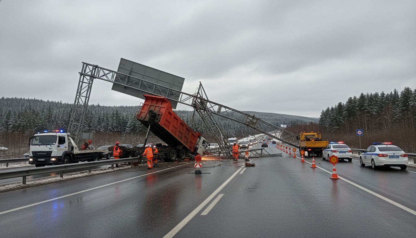 Грузовик снёс опору дорожных знаков, перекрыв движение на несколько часов