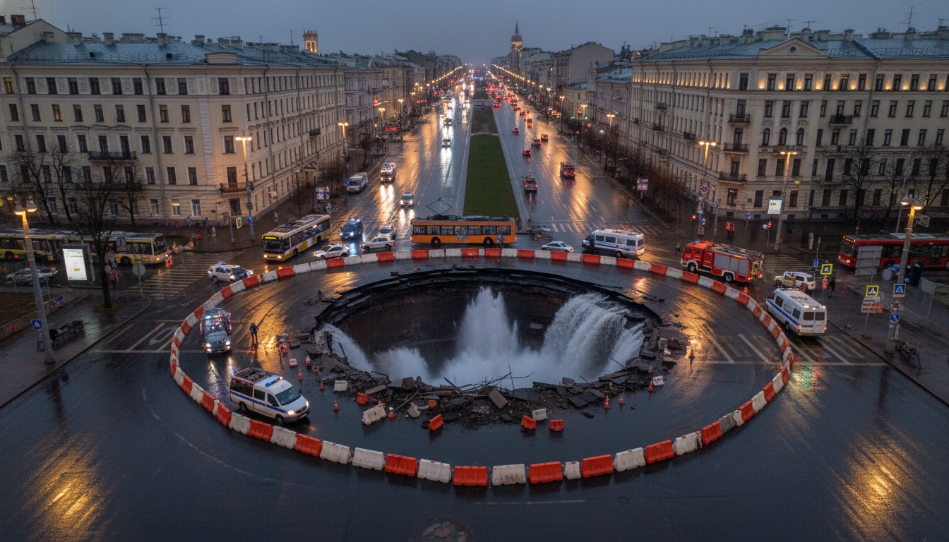 PeterburgMedia, 9 ноября 2025. Гигантская яма образовалась на проспекте Энгельса в Санкт-Петербурге в ночь на 9 ноября 2025 года из-за прорыва трубы. Из-за происшествия автобусы маршрутов 86 и 98, а также трамваи 20, 21 и 40 временно изменили свои маршруты.