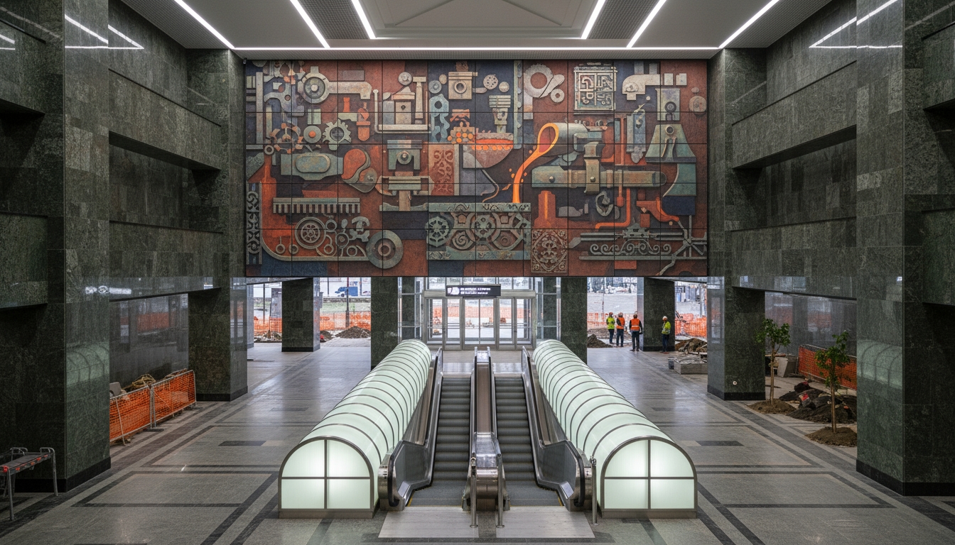 PeterburgMedia, 10 ноября 2025. В вестибюле станции метро «Путиловская» завершили монтаж масштабного панно, посвящённого истории Путиловского завода. Композиция выполнена из сотовых алюминиевых панелей с печатью, её ширина варьируется от 8 до 15 с небольшим метров. Художественное решение символически отражает машиностроительное, чугунное и художественно-литейное производства.