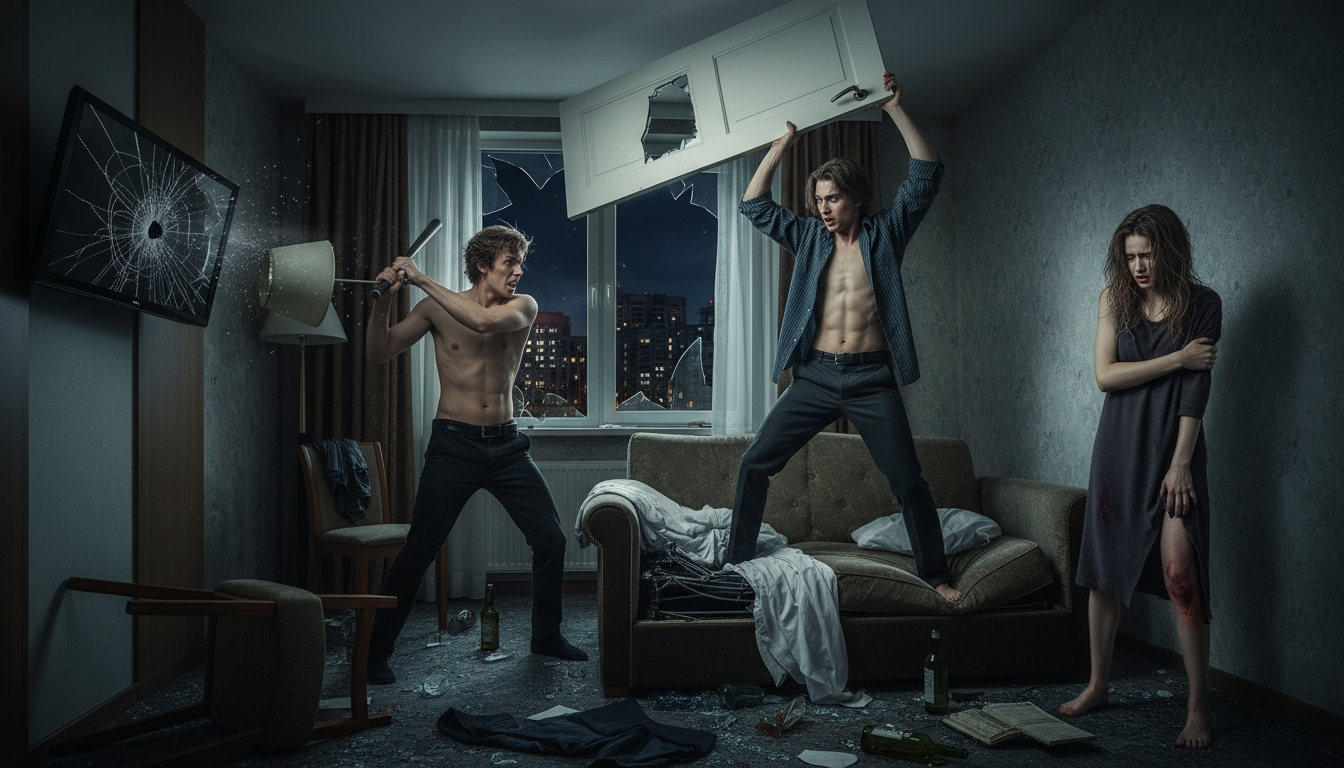 Молодые люди 23 и 25 лет находились в номере вместе со знакомой. В какой-то момент между ними вспыхнула ссора, переросшая в драку. В порыве гнева они «с мясом» вырвали дверь в уборную, повредили телевизор и сломали диван. Также пострадавшей девушке нанесли несколько резано-колотых ран на руке и ноге.