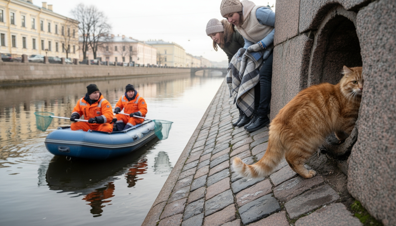 PeterburgMedia, 12 ноября 2025. 12 ноября на набережной канала Грибоедова в Петербурге волонтёры пытаются спасти кота, застрявшего в дренажной трубе. Животное уже несколько дней прячется внутри и убегает при приближении людей.