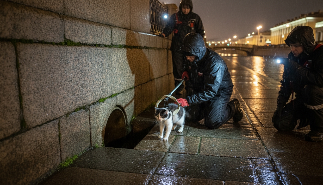 PeterburgMedia, 14 ноября 2025. Черно-белого кота, неделю провисшего в дренажной трубе под плитами набережной канала Грибоедова в Петербурге, успешно спасли в ночь на 14 ноября. Операция завершилась около 3:40 утра при участии волонтёра Алексея Т. и других спасателей, несмотря на плохую погоду.