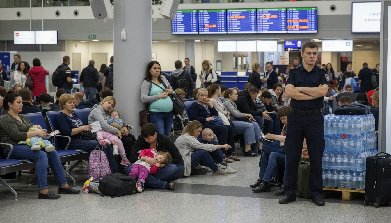 Людей разместили в бизнес-зале, рассчитанном на вдвое меньшее количество человек. Среди застрявших — дети и беременные женщины. Пассажиры жалуются, что им отказывают в еде и воде. В соцсетях появилось фото, где сотрудник охраны стоит рядом с запасами воды, не позволяя пассажирам к ней подойти.