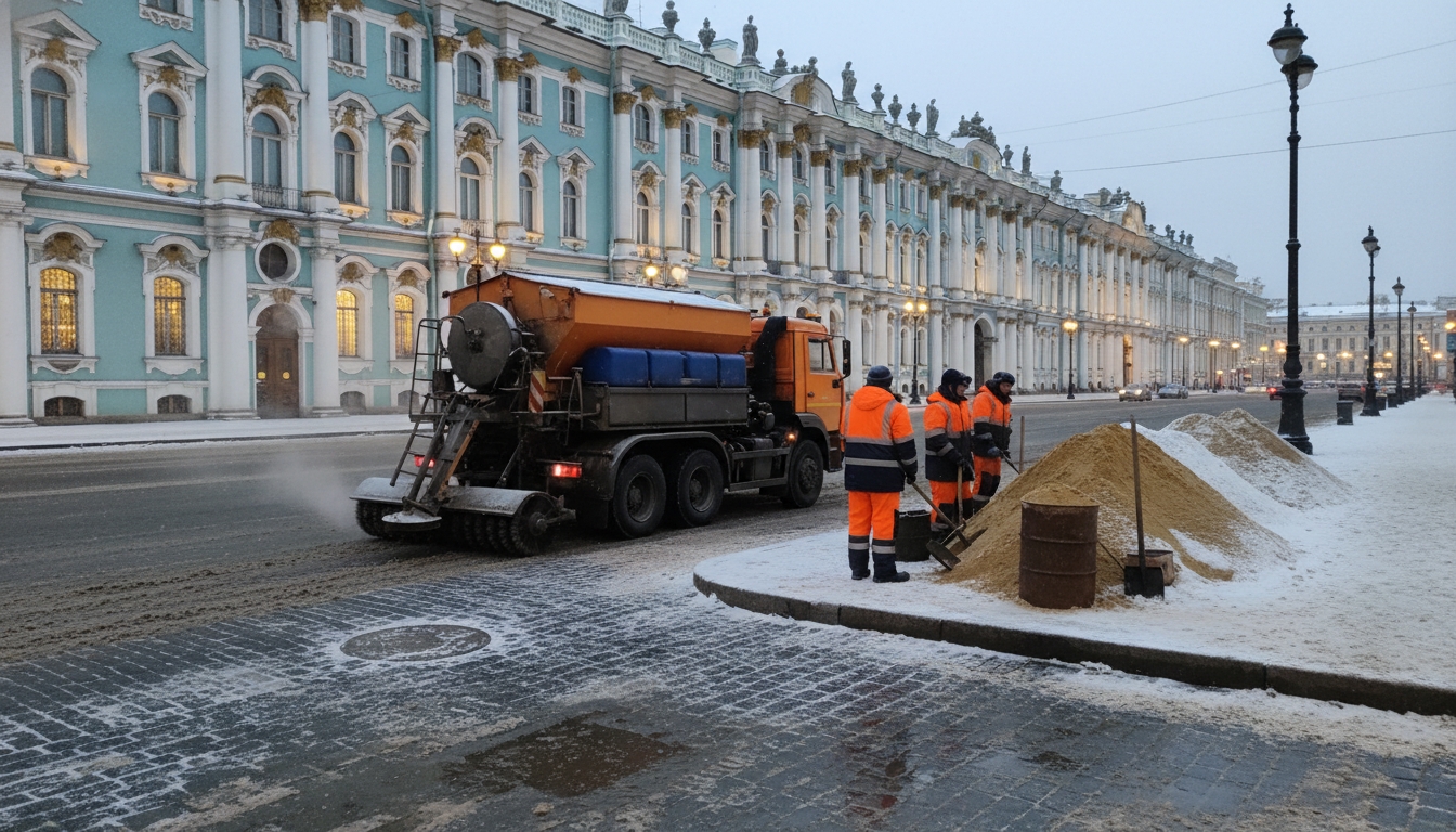 PeterburgMedia, 17 ноября 2025. В Петербурге стартовала обработка улиц противогололедными материалами. Власти города уже начали посыпать дороги солью и песком, закупив в этом году рекордные 168 тысяч тонн соли и 68 тысяч тонн песка.