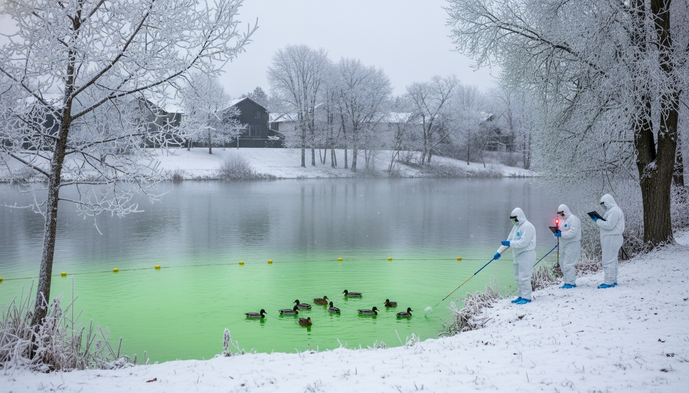PeterburgMedia, 28 ноября 2025. Во Всеволожске в озере, где обитают утки, обнаружили кислотно-зелёную неоновую жидкость. Инцидент произошёл 28 ноября 2025 года около 13:30.