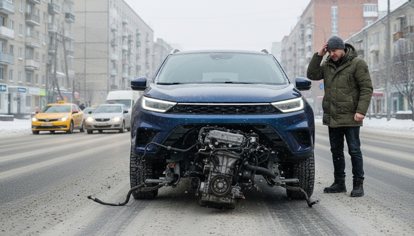 PeterburgMedia, 28 ноября 2025. У петербуржца во время движения оторвало двигатель у китайского кроссовера SWM G01 2023 года выпуска. Мотор буквально провалился под днище — его оторвало от подушек крепления из-за некачественных болтов. Пробег автомобиля на момент инцидента составлял всего 60 тысяч километров.