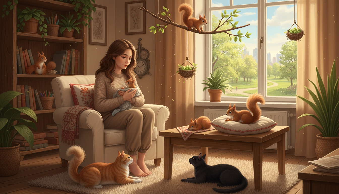 PeterburgMedia, 30 ноября 2025. Петербургская волонтёрка Ксения Артеменко уже в этом году выходила 14 бельчат, пострадавших или оставшихся без родителей. Сейчас в её квартире живут сразу семь белок, а также домашние питомцы — кот и кошка.