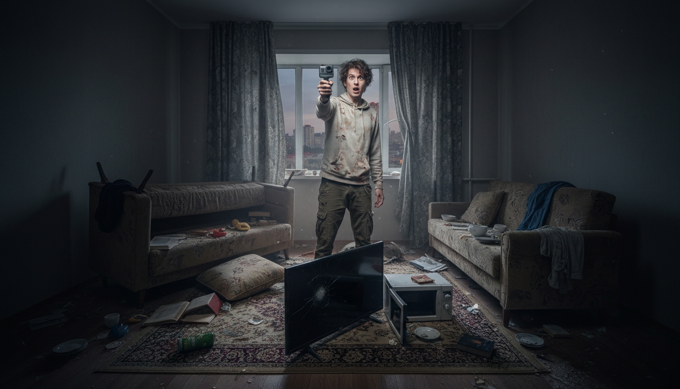 Видеозапись, присланная очевидцами, показывает, как Иван Ш. в прямом эфире разрушает квартиру: пинает телевизор, переворачивает холодильник, разбивает микроволновку и срывает шторы. По информации свидетелей, он арендует жильё специально для таких «экшенов», чтобы получать донаты от зрителей.