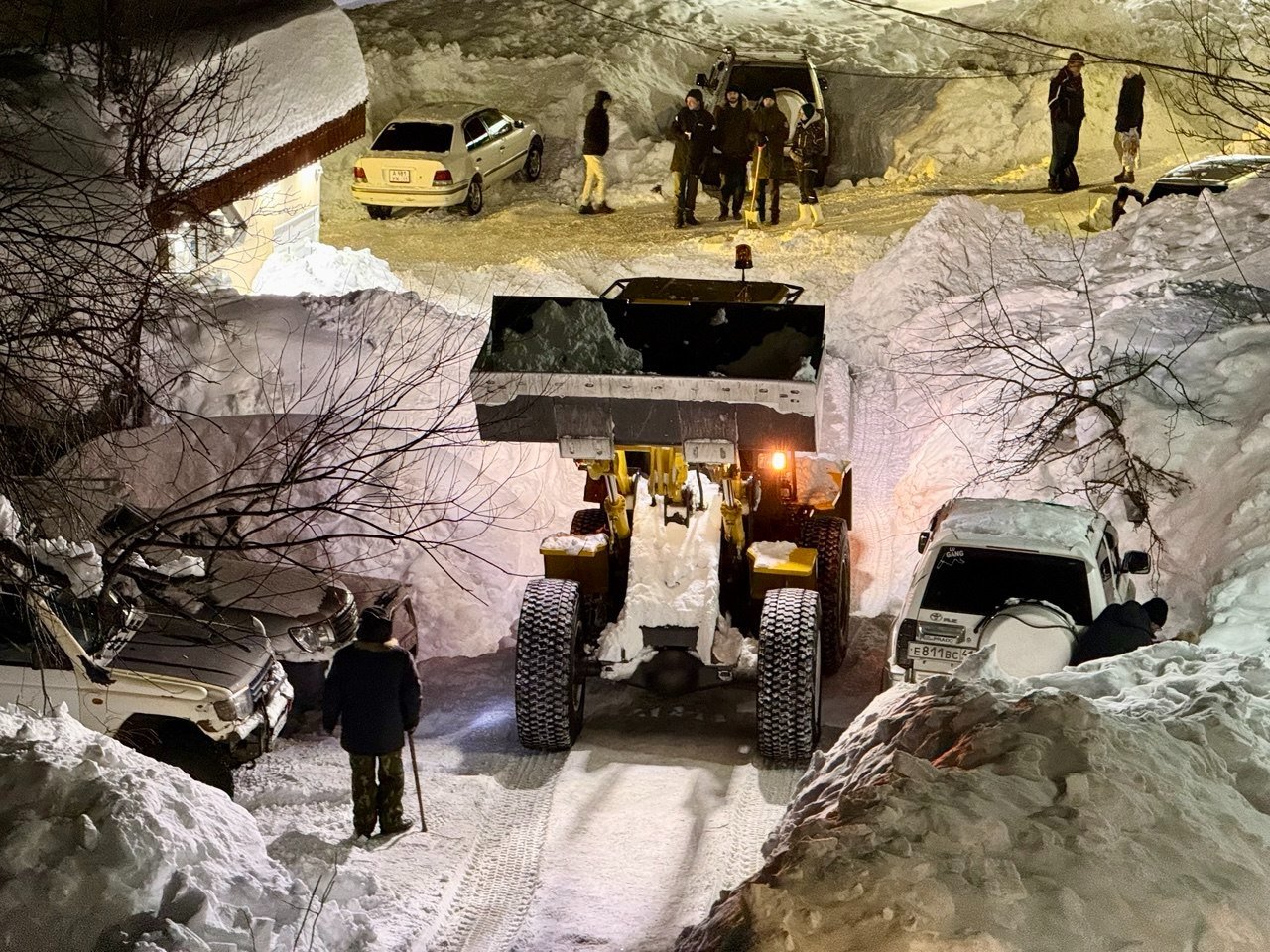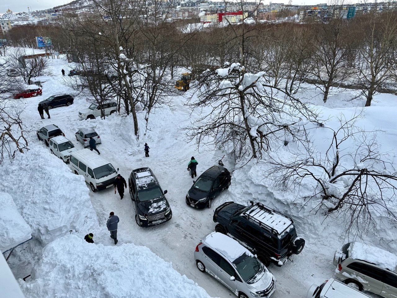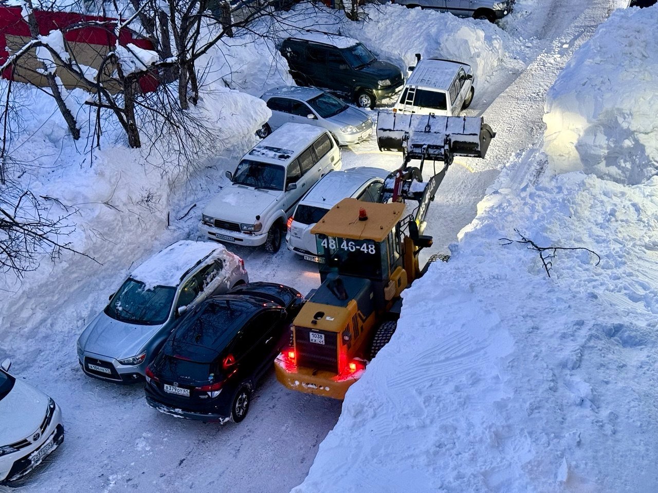 Обычный двор в Петропавловске-Камчатском. Последний раз снег убирали в середине декабря. После всех циклонов проезд полностью заблокирован уже две недели. Невозможно вывезти мусор, проехать пожарным и скорой, подвести товары в окрестные магазины. Попытка погрузчика пробиться в соседний двор закончилась крахом — спецтехника чуть не свалилась в яму со свежеоткопанным автомобилем, а потом превратила въезд в площадку для могула с трамплинами и ухабами.