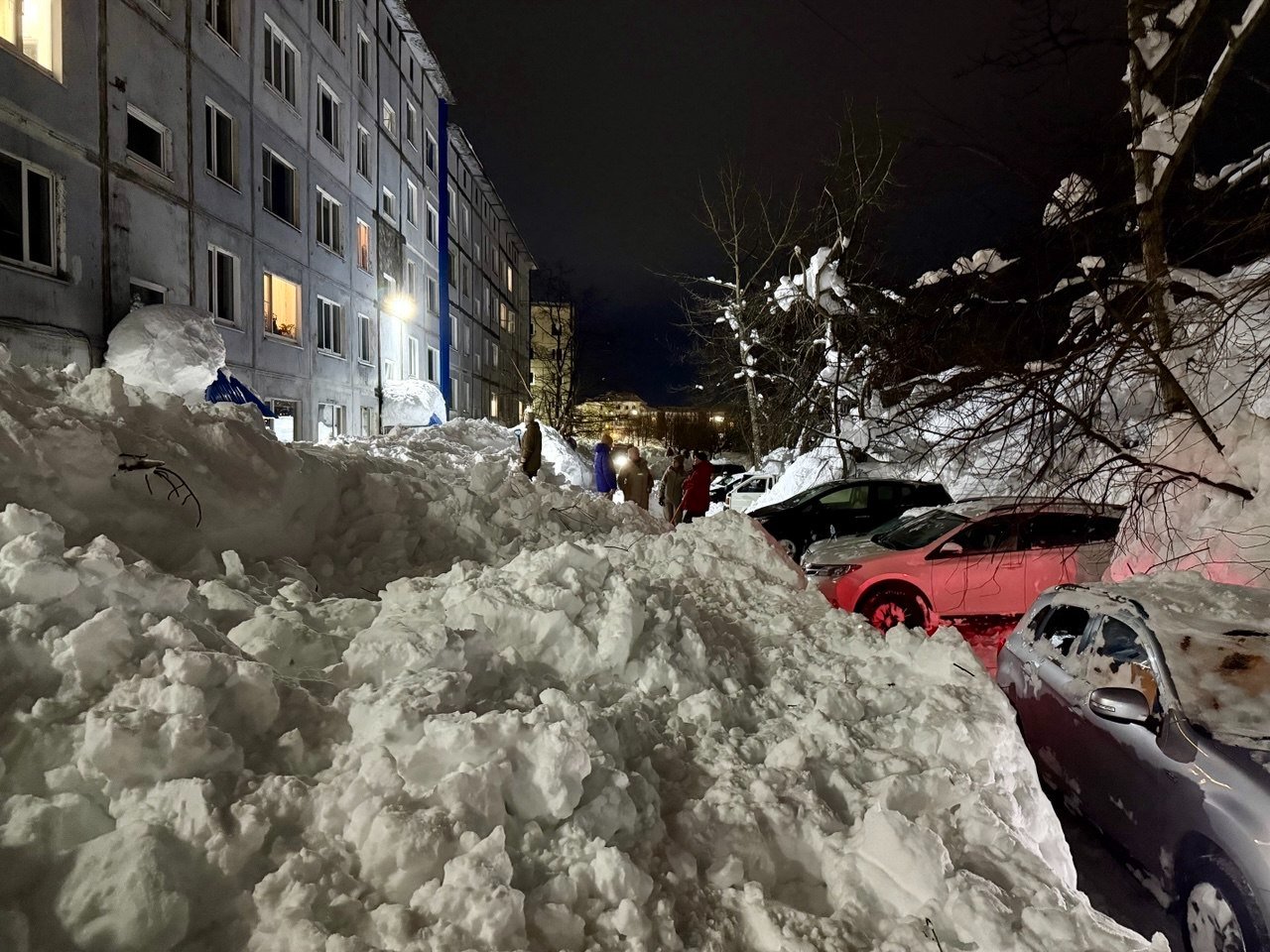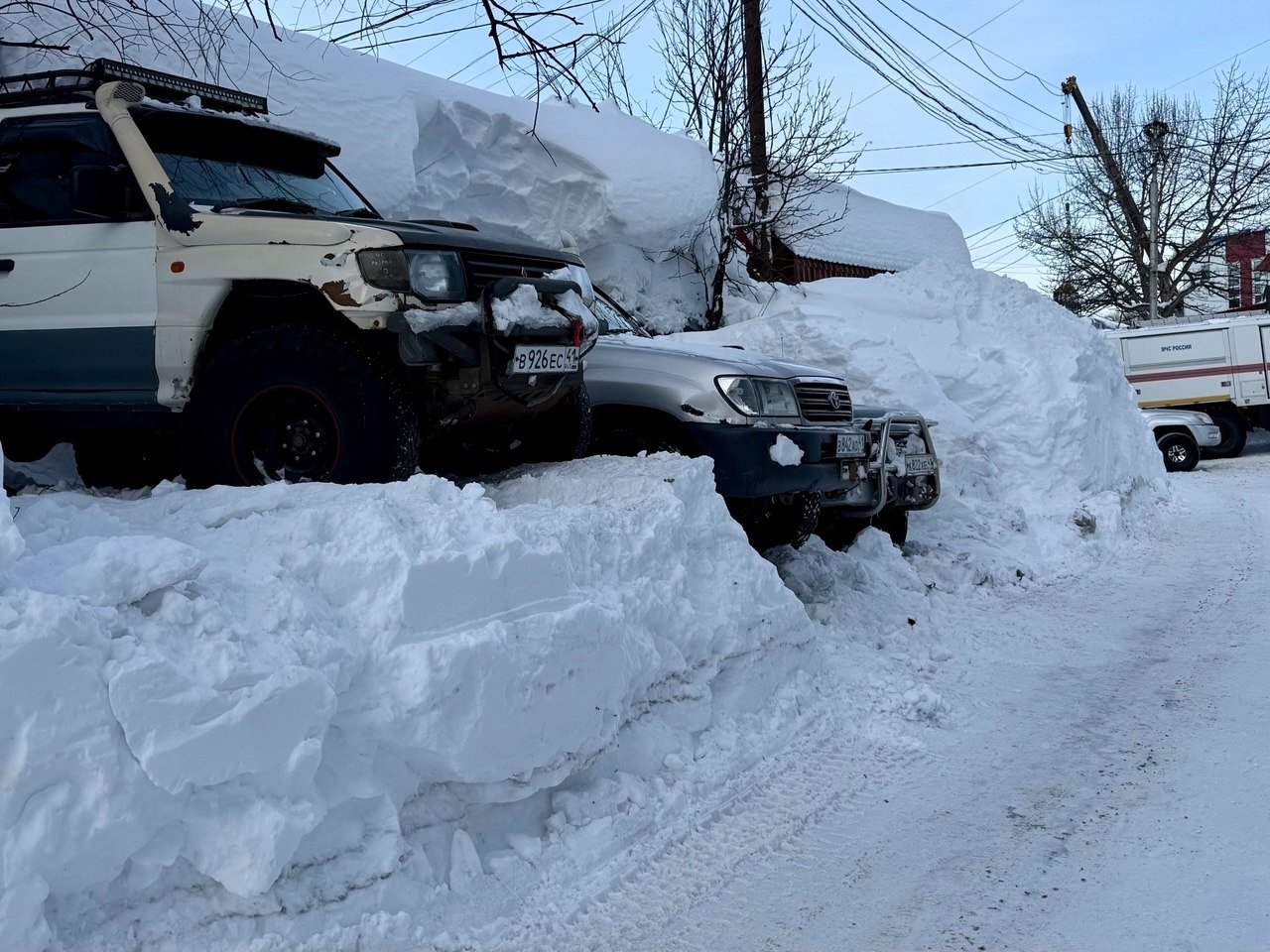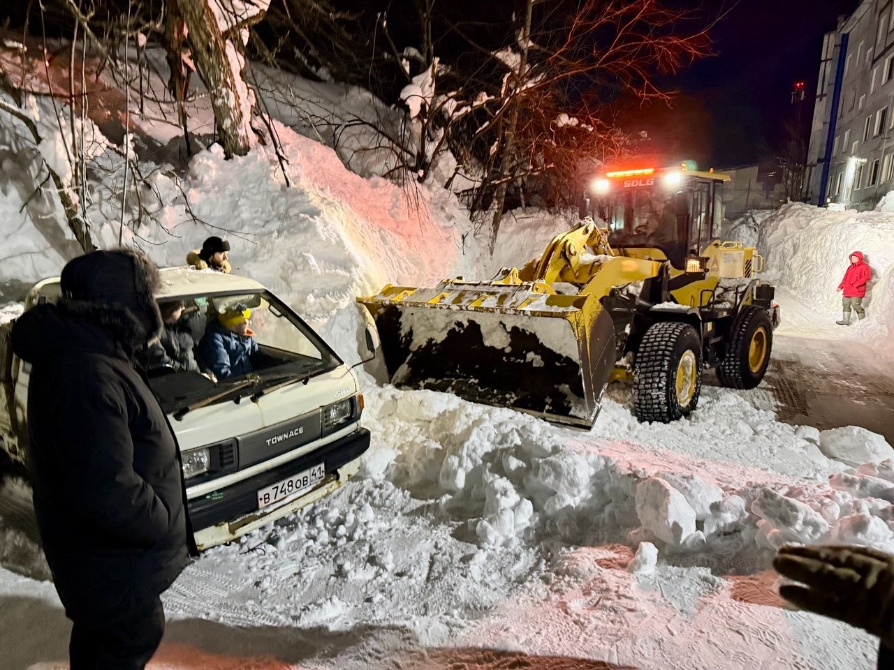 Обычный двор в Петропавловске-Камчатском. Последний раз снег убирали в середине декабря. После всех циклонов проезд полностью заблокирован уже две недели. Невозможно вывезти мусор, проехать пожарным и скорой, подвести товары в окрестные магазины. Попытка погрузчика пробиться в соседний двор закончилась крахом — спецтехника чуть не свалилась в яму со свежеоткопанным автомобилем, а потом превратила въезд в площадку для могула с трамплинами и ухабами.