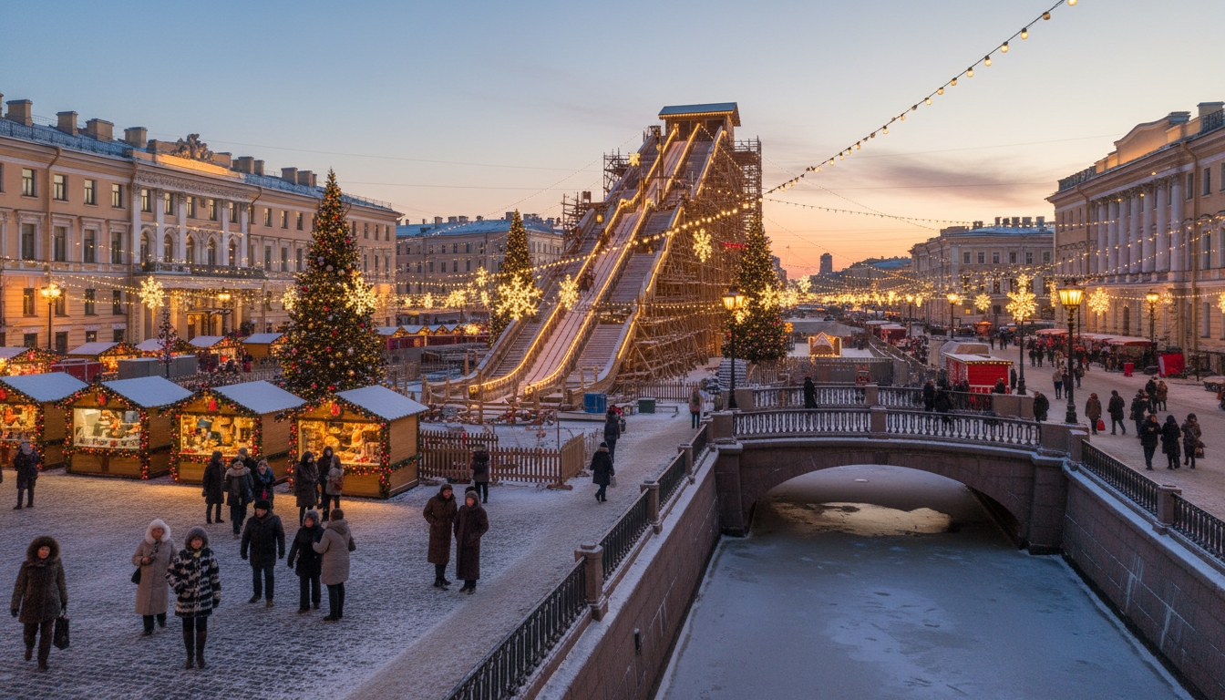 PeterburgMedia, 18 ноября 2025. На Дворцовой площади в Санкт-Петербурге 18 ноября начали собирать восьмиметровую новогоднюю горку. Материалы уже разложены и готовы к монтажу. Аттракцион разместят рядом с Певческим мостом, а вокруг установят праздничные украшения и яркие торговые павильоны.