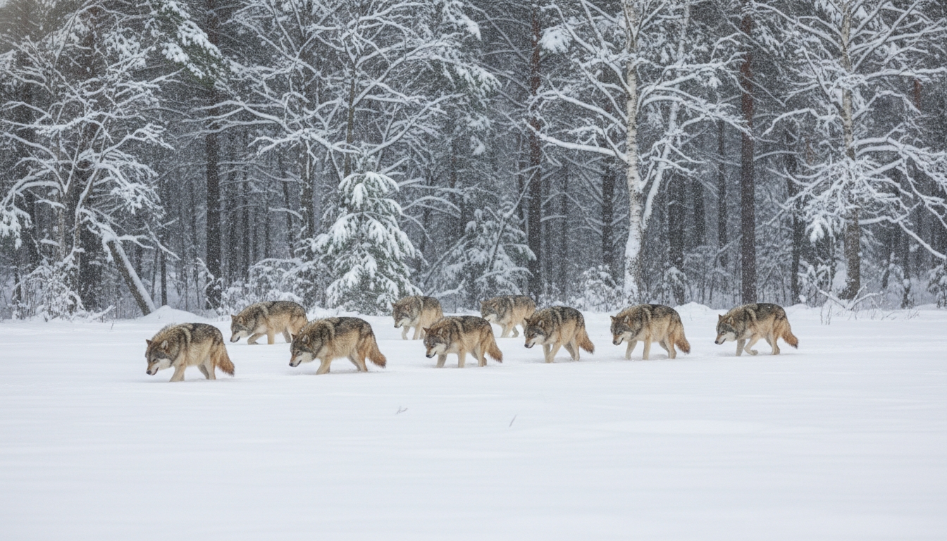 PeterburgMedia, 7 декабря. 7 декабря 2025 года в одном из российских заповедников фотоловушка засняла волчью стаю, идущую под снегопадом. Кадры вызвали интерес у пользователей соцсетей.
