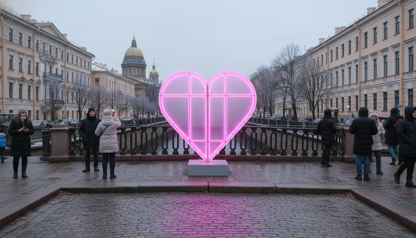 «Розовое сердце вновь засияло на Итальянском мосту», — сообщили очевидцы. Другие добавили: «Яркая инсталляция в форме сердца появилась на Итальянском мосту».