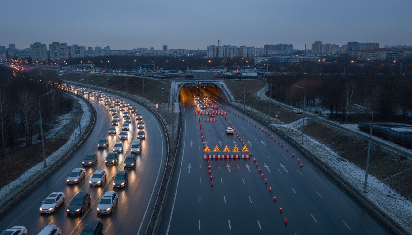 Движение по внешней стороне кольцевой автодороги в районе тоннеля перекрыто без объяснения причин