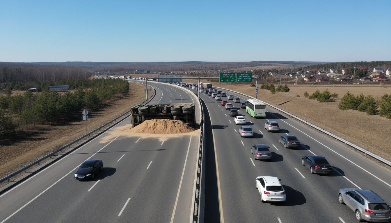 Самосвал с песком перевернулся на КАД, образовалась пробка