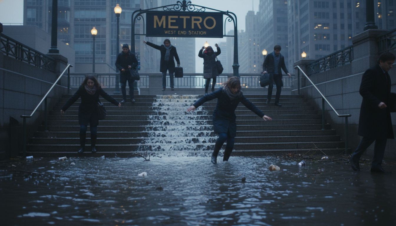 У входа на станцию скопилась вода, пассажирам приходится пробираться через лужи